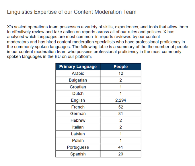 De Digital Services Act eist van zeer grote platforms zoals X dat ze regelmatig updates geven over allerlei aspecten van de dienst. Deze transparantierapporten moeten elke zes maanden uitkomen, en een van de verplichte elementen is het aantal “human resources” per officiële EU-taal en hun kwalificaties. Dat doet X dus zo: